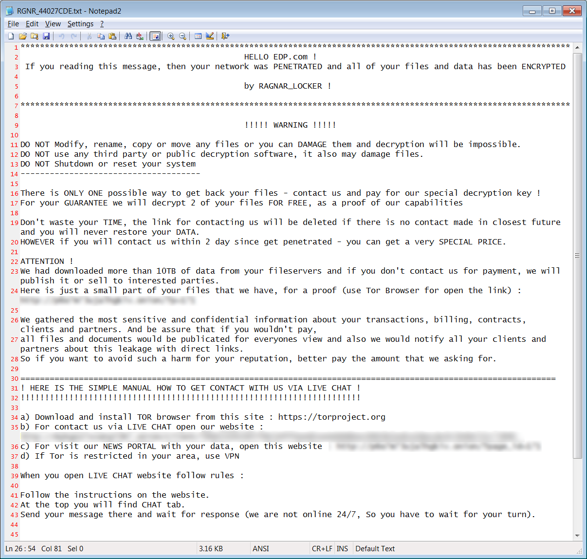 The EDP ransomware attack is thought to be fuelled by the “Ragnar Locker” variant, enabling the criminals to gain access to systems and demanding payment within 20 days to prevent the release of sensitive information. The ransom note left (see picture below) threatened to publish 10TB of data from the company’s file servers or sell it to ‘interested parties’ if they failed to pay.